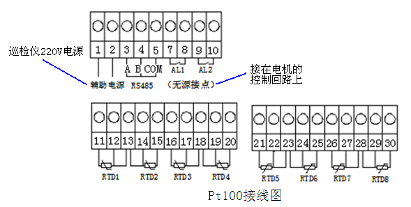 當測量溫度高于巡檢儀設定的最高溫度時,巡檢儀內部觸點AL1、AL2動作(通過設置),切斷電機控制回路以達到關斷電機電源,保護電機的目的。