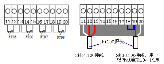 根據左側接線圖接三線制和二線制Pt100,白線為Pt100正,紅線為負,藍線為二線制Pt100添加的導線。