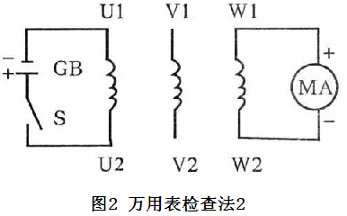 ①萬(wàn)用表置mA檔,按圖1接線。假設(shè)一端接線為頭(U1、Vl、W1),另一端接線為尾(U2、V2、W2)。