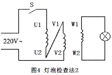 ②閉合開關(guān)S,如36V燈泡亮,表示接220V電源兩相繞組為頭、尾串聯(lián)。如燈泡不亮表示兩相繞組為頭、頭或尾、尾串聯(lián)。